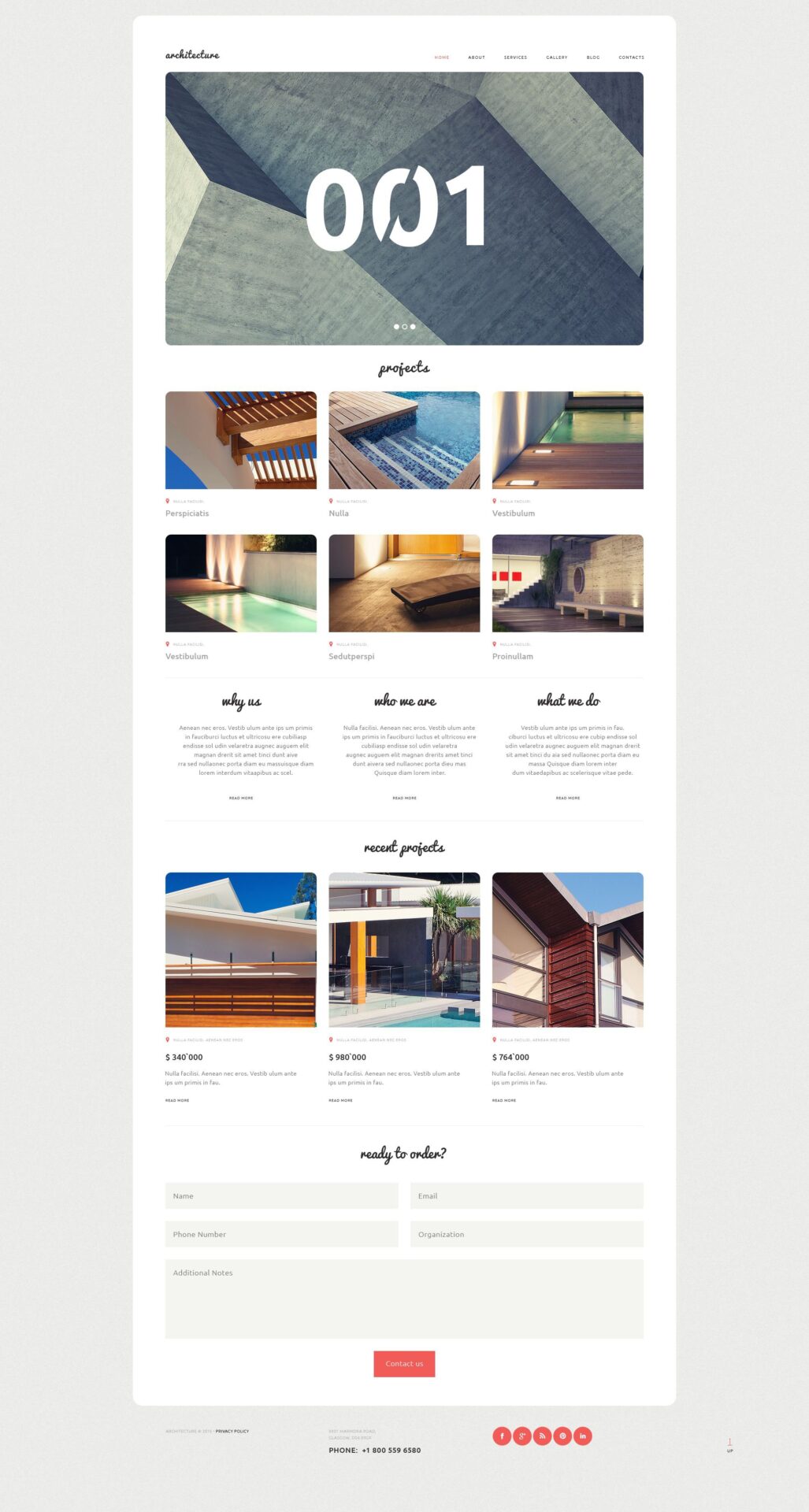 It’s very important for architectural bureau to have a well structured site, like this one. Designer has chosen handwritten fonts for logo and headings. They are easy to scan as the unusual script is rather noticeable on the page. Slider and projects sections highlight the best architectural solutions of the company. Information about the bureau and its services is above the recent projects section. Simple order form is at the bottom of the page. Social sharing block can be found at the footer.