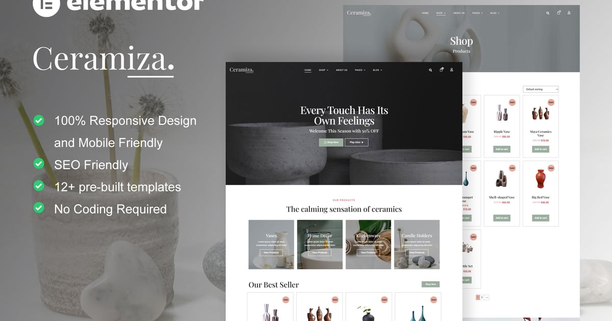 Ceramiza is Elementor Template Kit for pottery and ceramic decor website. This template kit will help you to create any website related to pottery and ceramic decoration store. You can also use this elementor template kit for any decoration website, interior design store, furniture website store using WooCommerce + Elementor. It has 12+ pre-built templates with clean design and modern style.