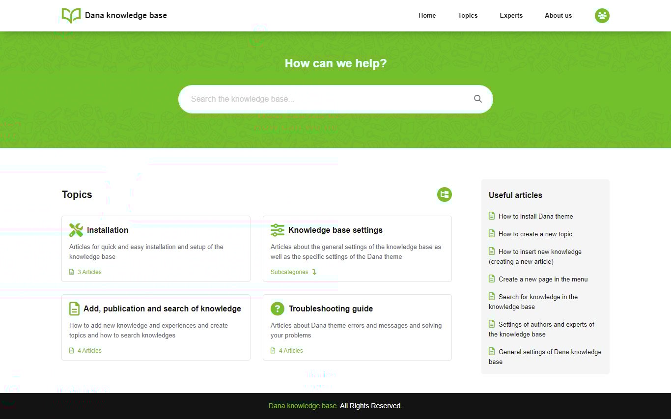 Dana WordPress theme is a knowledge base. This theme allows you to maintain and disseminate valuable knowledge within your organization and easily set up a help center and provide 24/7 service to your customers.