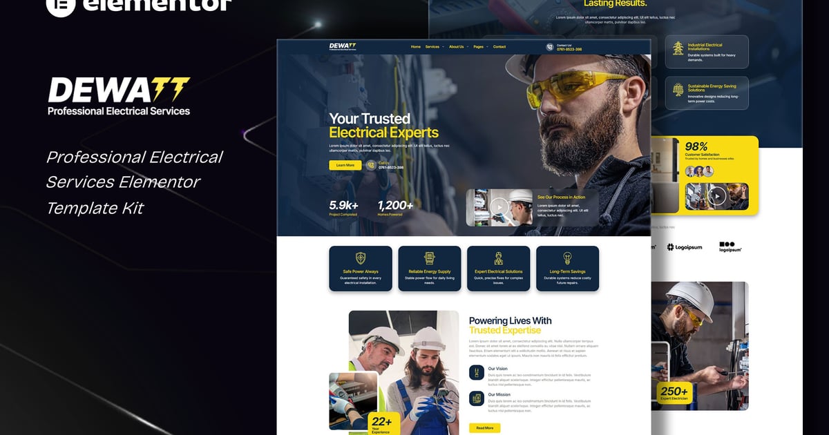 Meet, Dewatt specially designed for electrician and electricity services businesses website! This kit has a modern and creative design with a 100% fully responsive layout, easy installation, and sure very easy to customize because using Elementor so you don’t need a single line of coding!Save your time.