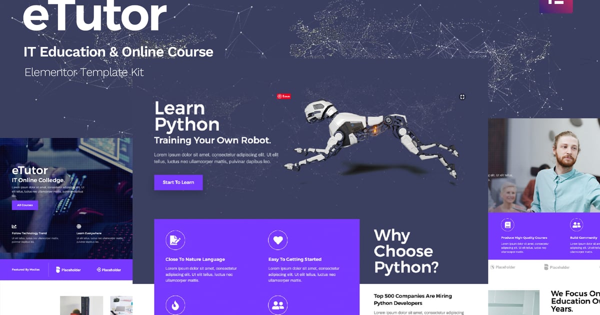 eTutor is an Elementor ProTemplate Kit for quickly and easily creating websites for your school, course or agency using the Elementor Page Builder plugin for WordPress. This is not a WordPress theme. Template Kits contain page content for Elementor page builder. This kit has been optimized for use with the free Hello Elementor theme but may be used with most themes that support Elementor.