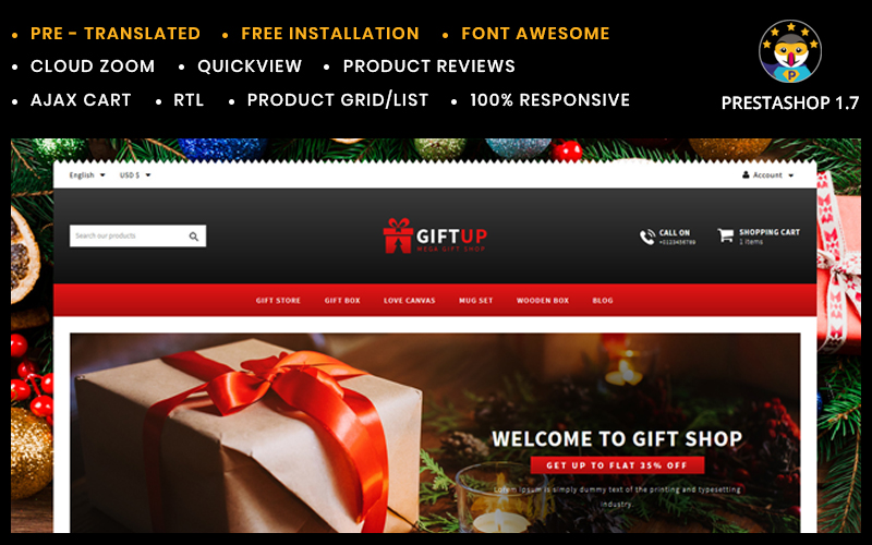 GiftUp Prestashop 1.7 Theme is fully responsive and is developed with a fully featured homepage layout, All theme pages are fully customized, It’s very easy to install the theme using the Quick Start package for new and fresh Prestashop stores, also you can use this theme with your existing store by installing theme installer provided in the theme package, Homepage designed with latest eCommerce trends.