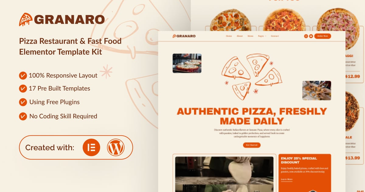 Granaro is a professional, modern and clean Elementor Template Kit designed for pizza restaurant, restaurants, and fast food, and any other related food businesses. Built for WordPress, it seamlessly integrates with Elementor, enabling you to craft a professional website effortlessly—no coding skills required.