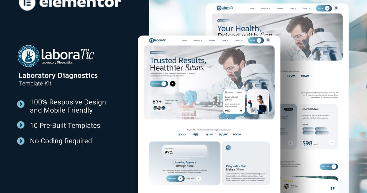 Laboratic is a modern and professional Elementor Template Kit designed for laboratory diagnostics and medical testing websites. Perfect for diagnostic centers, clinical laboratories, and health testing providers, this kit helps you showcase your services with clarity, highlight your expertise, and build trust with patients. With its clean design and user-friendly layout, Laboratic ensures your brand reflects accuracy, reliability, and professional care. Laboratic uses free elements, so don’t worry about trying this one. Laboratic provides various pages including Home, About Us, Team, Services, Pricing, Testimonials, FAQs, Blog, 404, Contact Us.
