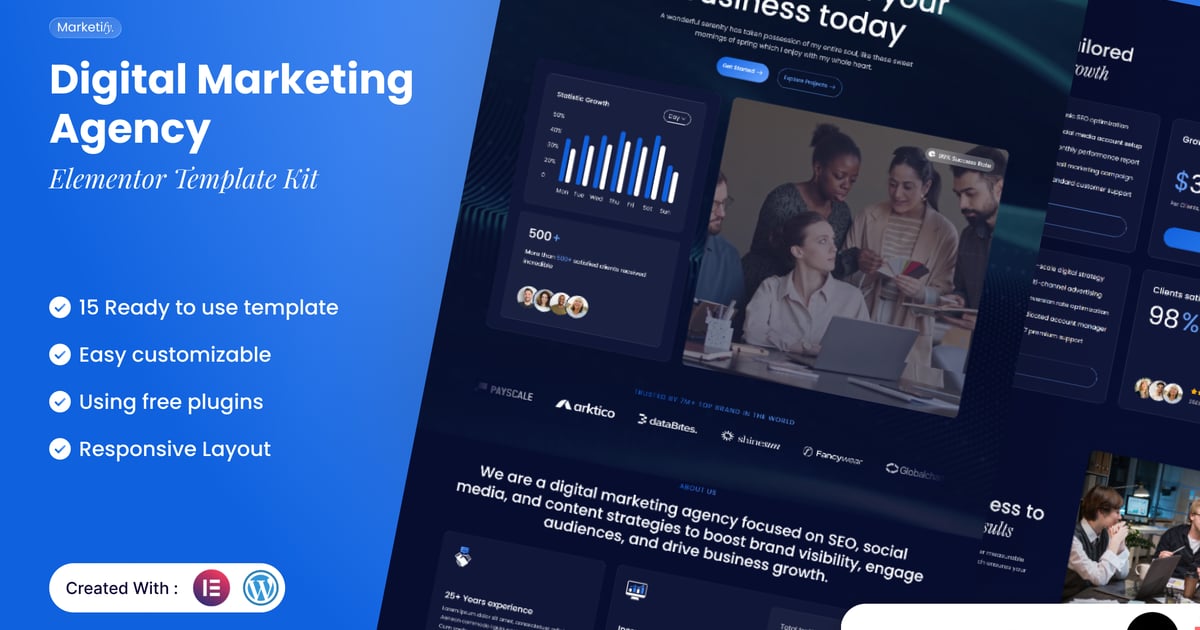 Marketify – Digital Marketing Agency Elementor Template Kit is a sleek and conversion-focused website solution designed for digital marketers, creative agencies, and online strategists. Built with WordPress and fully compatible with Elementor Free, Marketify allows you to create a professional website that highlights your expertise, services, and results without any coding required.