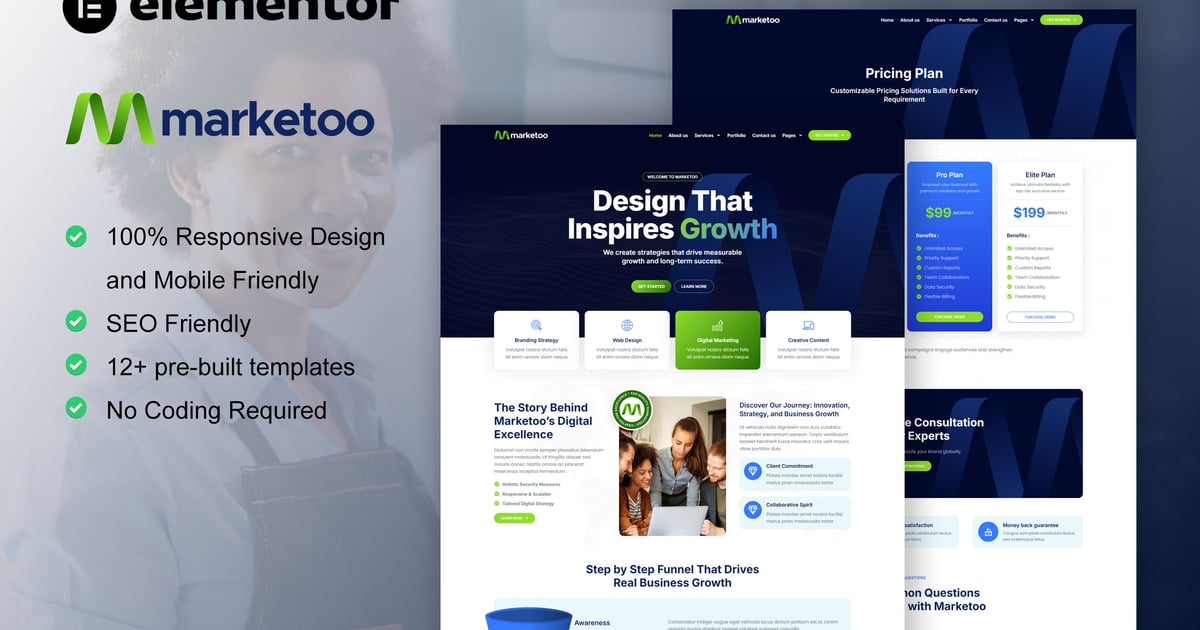 Marketoo is an Elementor Pro Template Kit for creative agency & digital marketing website. It has 12+ pre-built templates with cool design and modern style. You can also use this creative template kit for any kind of businesses or services such as social marketing, SEO service, website analysis, graphic design, web development, digital marketing and many others.