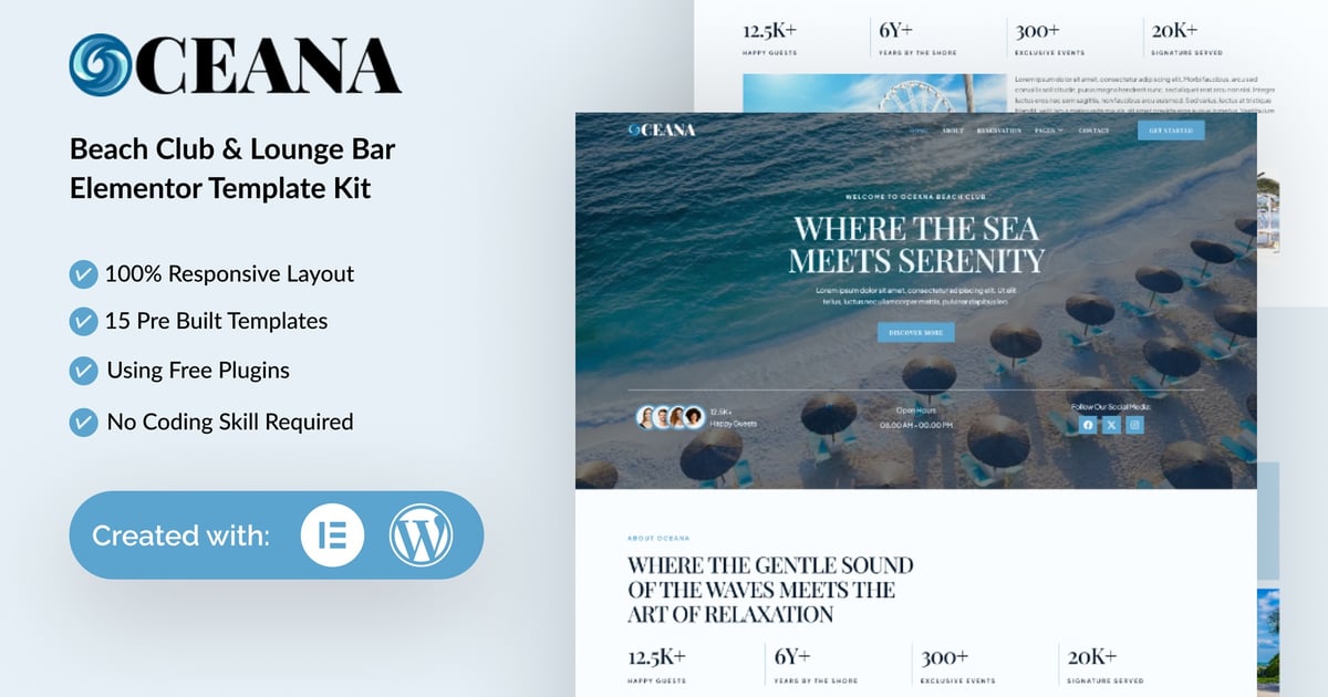 Oceana is a professional, modern and clean Elementor Template Kit designed for Beach Club & Lounge Bar Website. Built for WordPress, it seamlessly integrates with Elementor, enabling you to craft a professional website effortlessly—no coding skills required.