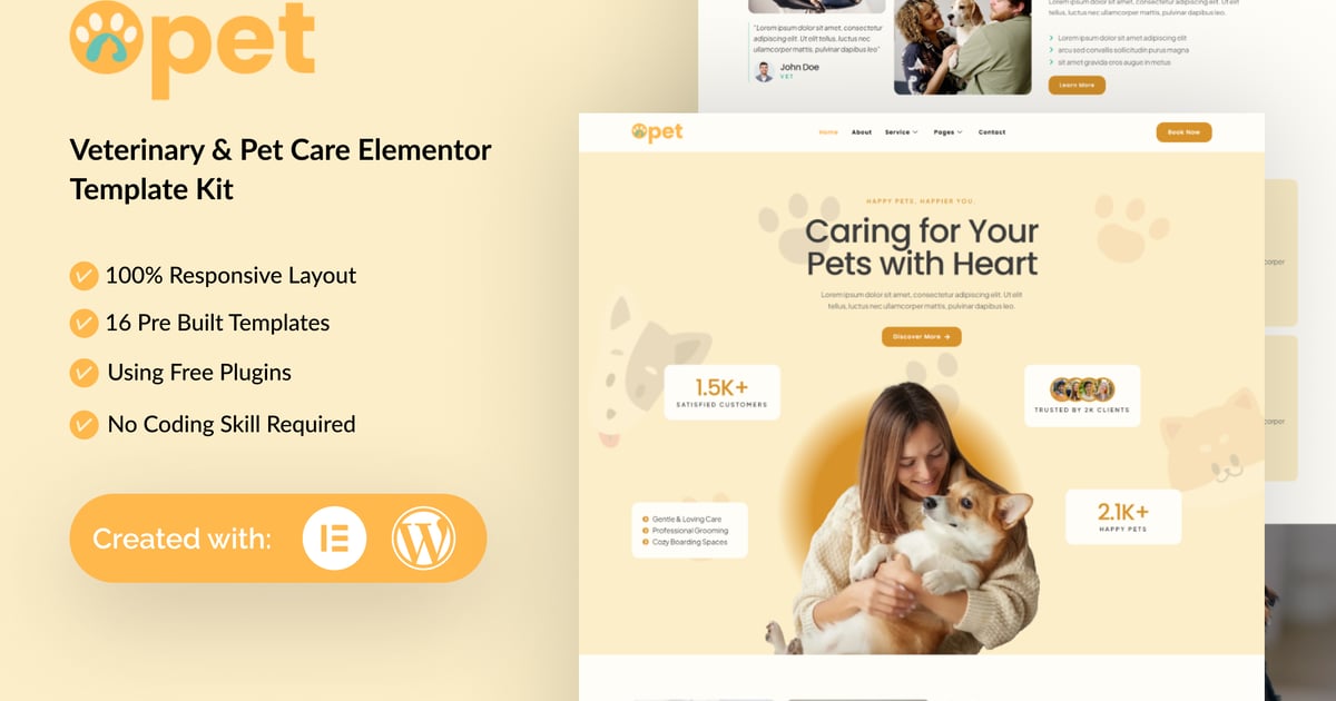 Opet is a professional, modern and clean Elementor Template Kit designed for Veterinary & Pet Care Website. Built for WordPress, it seamlessly integrates with Elementor, enabling you to craft a professional website effortlessly—no coding skills required.