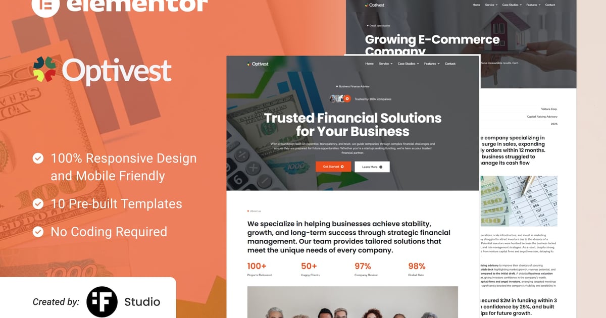 Optivest is an Elementor template kit designed for investment and financial business services. This kit works with the free version of Elementor, so you can start building without worries. It includes a variety of pages and blocks such as Home, Services, Service Details, Case Studies, Case Study Details, About, Blog, Single Blog, 404, and Contact.