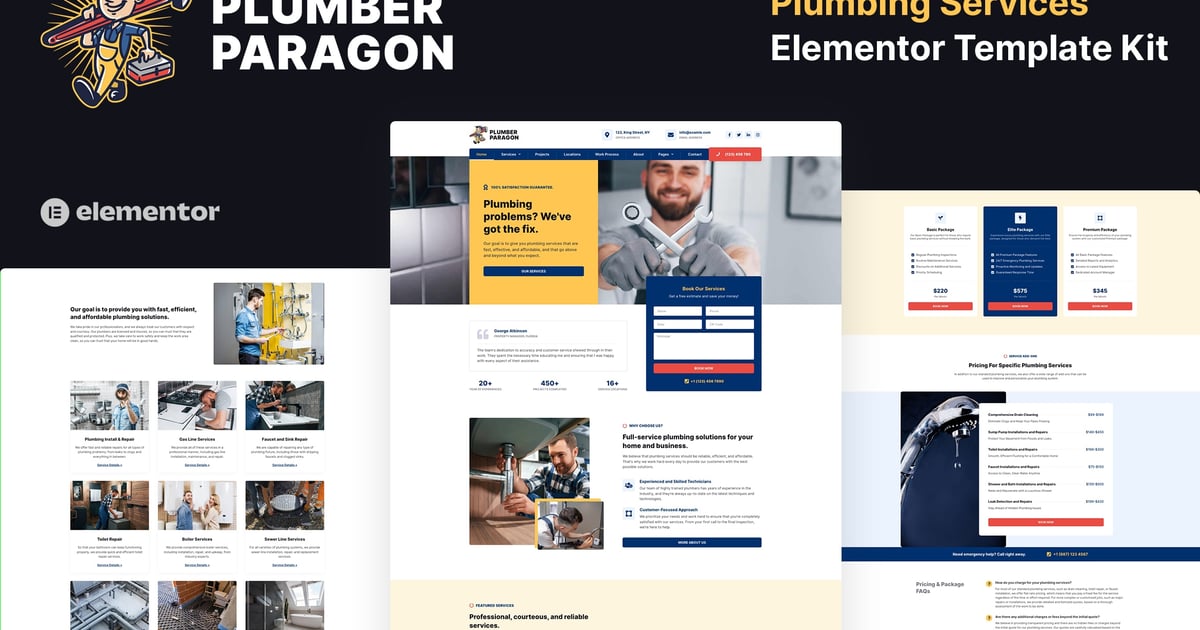 Plumber Paragon is designed for any plumbing-related service such as a pipe, leak, faucet, drain, toilet, water heater, shower, bathroom, plumbing installation & repair, plumbing maintenance, plumbing emergencies, and home care. Based on the Elementor Pro WordPress page builder, it has a 100% responsive design. This template kit is fully customizable, allowing you to customized the layout and color scheme to create a perfect website for your plumbing service business.