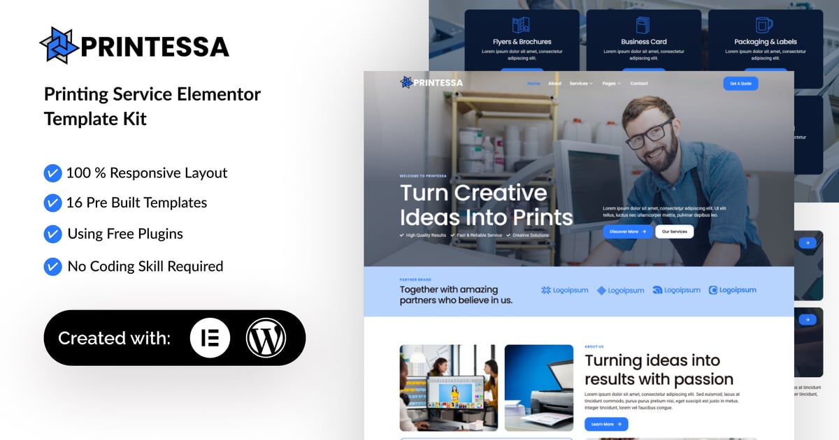 Printesa is a professional, modern and clean Elementor Template Kit designed for Printing Services Company Website. Built for WordPress, it seamlessly integrates with Elementor, enabling you to craft a professional website effortlessly—no coding skills required.