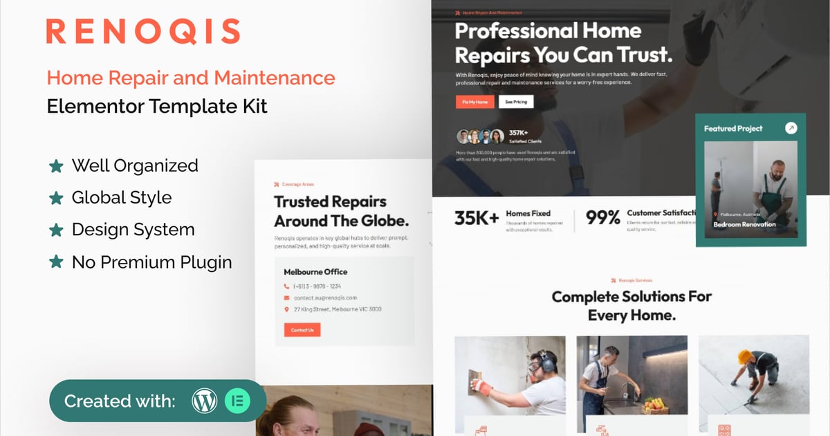 Introducing “Renoqis” – the ultimate Elementor & WordPress Template Kit tailored for the Home Repair and Maintenance industry. Designed to help repair service providers, contractors, and home improvement businesses establish a strong and professional online presence, Renoqis combines the ease of Elementor’s drag-and-drop builder with the scalability of WordPress. With more than 21 pre-designed pages, you can effortlessly launch a modern and conversion-focused website that highlights your expertise and attracts new customers.