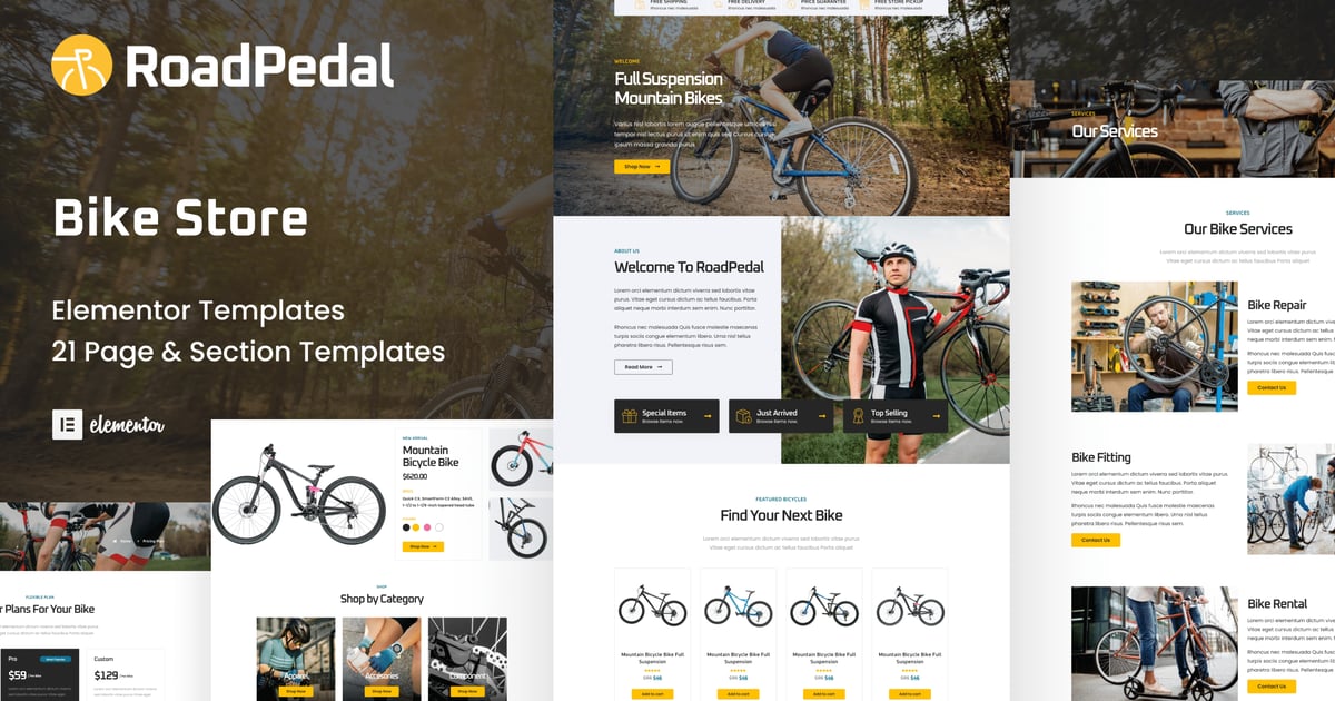 RoadPedal is an Elementor website template kit designed and developed specifically to help you create a dazzling bicycle online store website using WordPress, WooCommerce and Elementor.