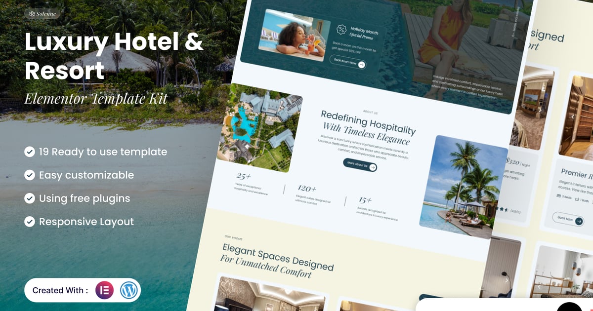 Solenne – Luxury Hotel & Resort Elementor Template Kit is an elegant and modern website solution crafted for luxury hotels, premium resorts, boutique stays, and exclusive vacation rentals. Built on WordPress and fully compatible with Elementor Free, Solenne helps you create a sophisticated online presence that reflects the charm, comfort, and exclusivity of your hospitality brand—without the need for coding.