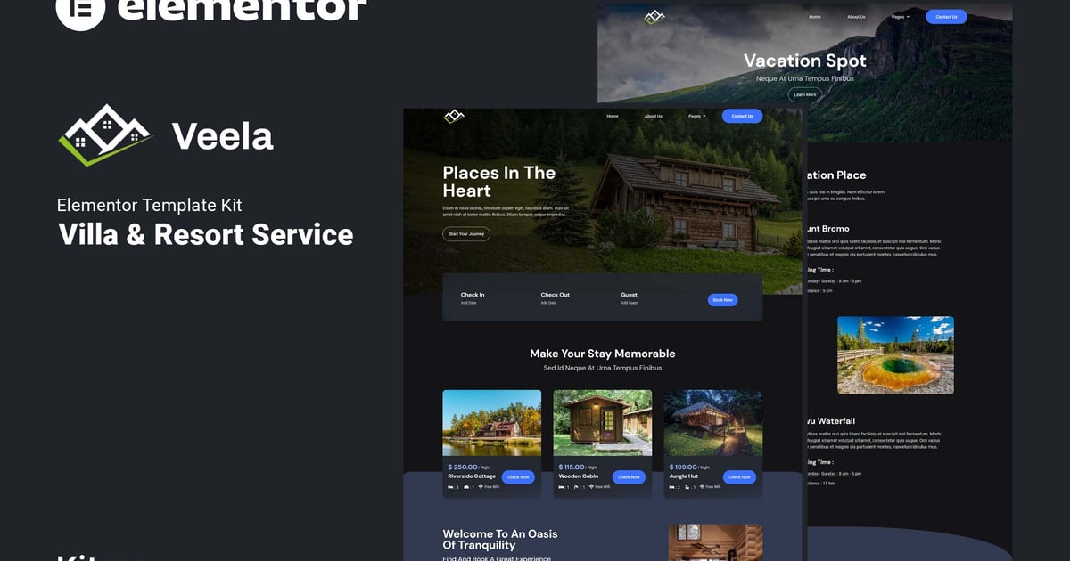 Veela is an Elementor Template Kit for quickly and easily creating websites for your resort or holiday rental business using the Elementor Page Builder plugin for WordPress. This is not a WordPress theme. Template Kits contain page content for Elementor page builder. This kit has been optimized for use with the free Hello Elementor theme but may be used with most themes that support Elementor.