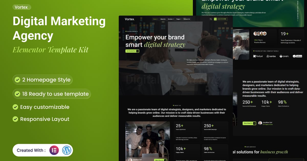 Vortex – Digital Marketing Agency Elementor Template Kit is a fresh and dynamic website solution crafted for digital agencies, creative studios, and marketing professionals who want a standout online presence. Built with WordPress and fully compatible with Elementor Free, Vortex makes it simple to create a professional, engaging, and high-performing website without coding.
